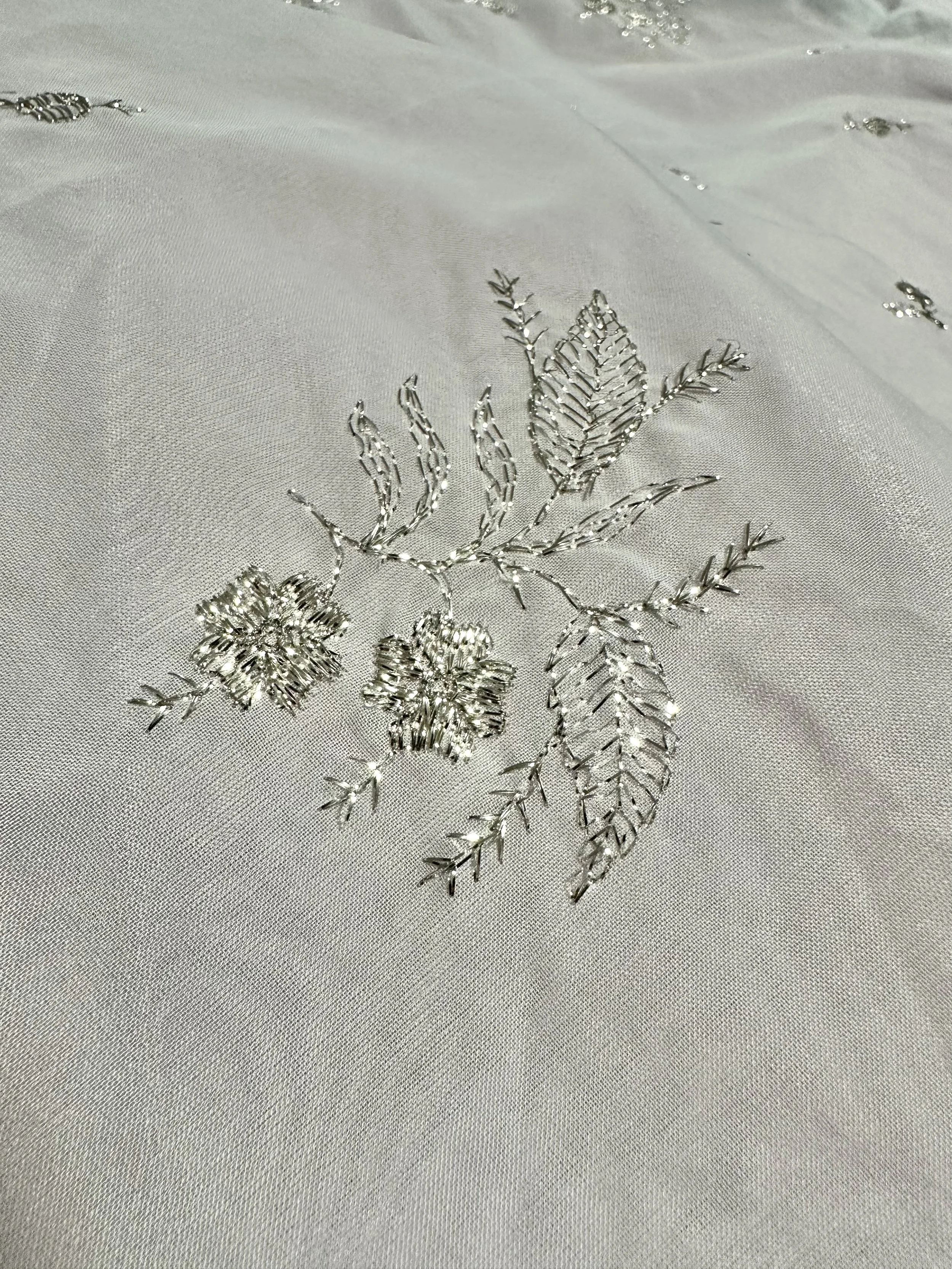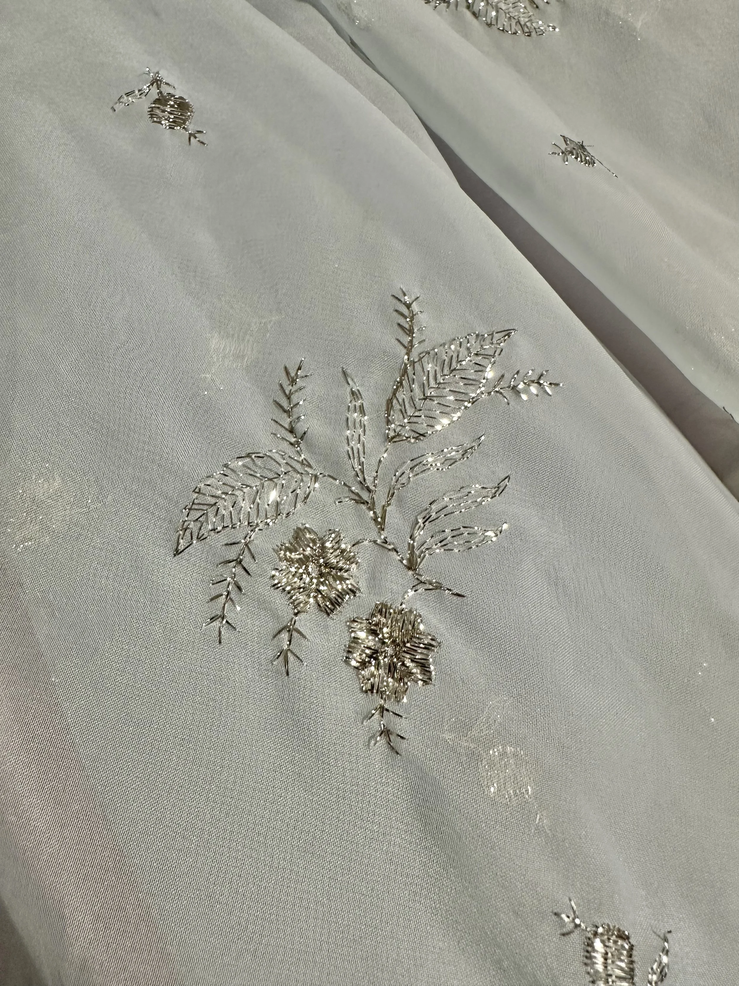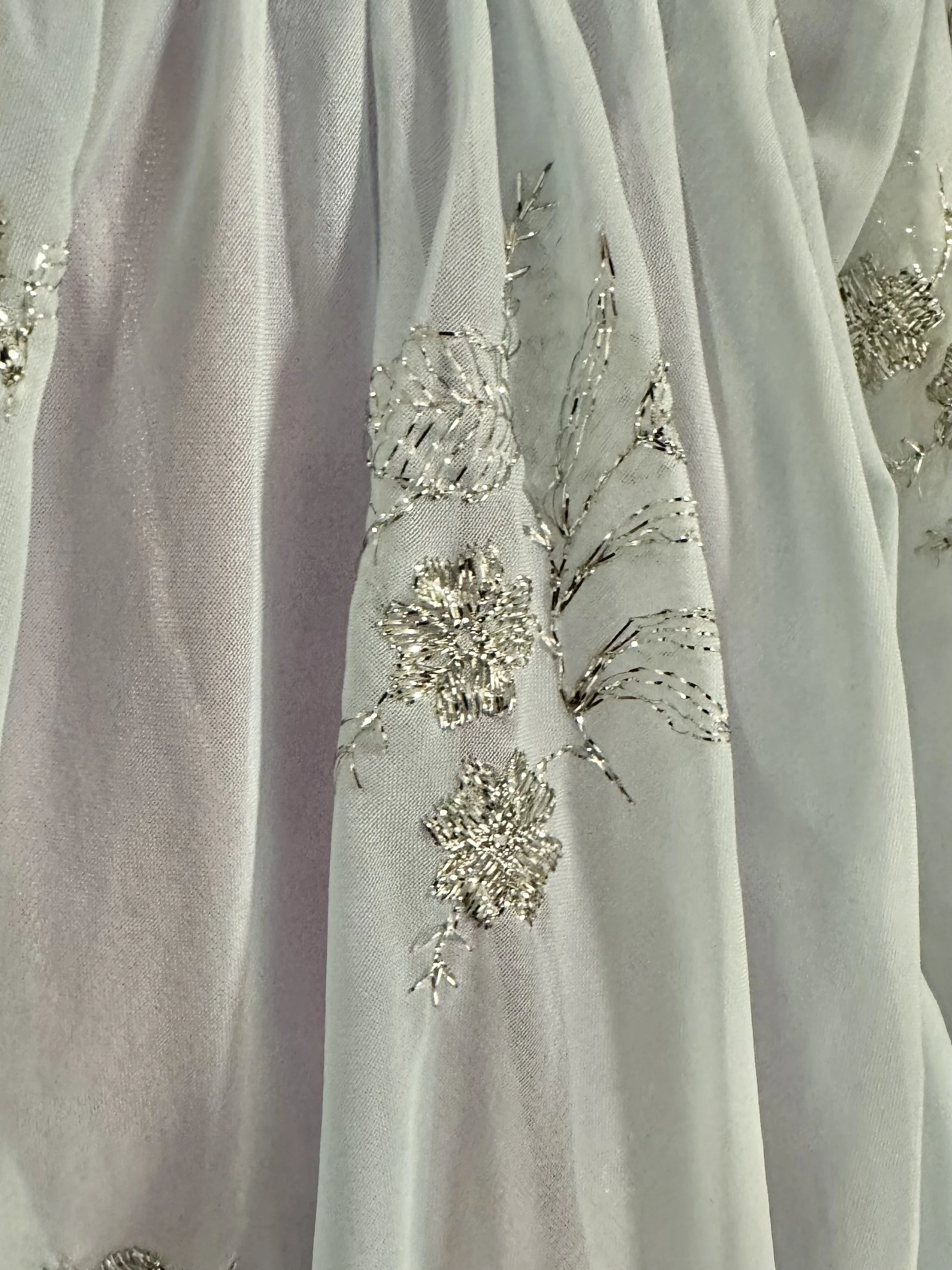 Colour: Purple taffeta underlay/Sky blue organza with silver embroidered motif overlay